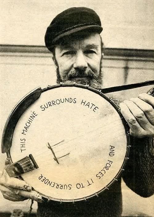 The second thing I noticed was his banjo. Remember, I didn’t know a thing about him, I didn’t know that he carried his banjo everywhere, that he offered to play a song for the House Un-American Activities Committee instead of naming names. I didn’t know he’d played We Shall Overcome on the steps of the Lincoln Memorial at the March on Washington in 1963. I didn’t realize that banjo had such a history. But as his fingers flew over the strings, I read the words that circled the instrument’s face: This machine surrounds hate and forces it to surrender.