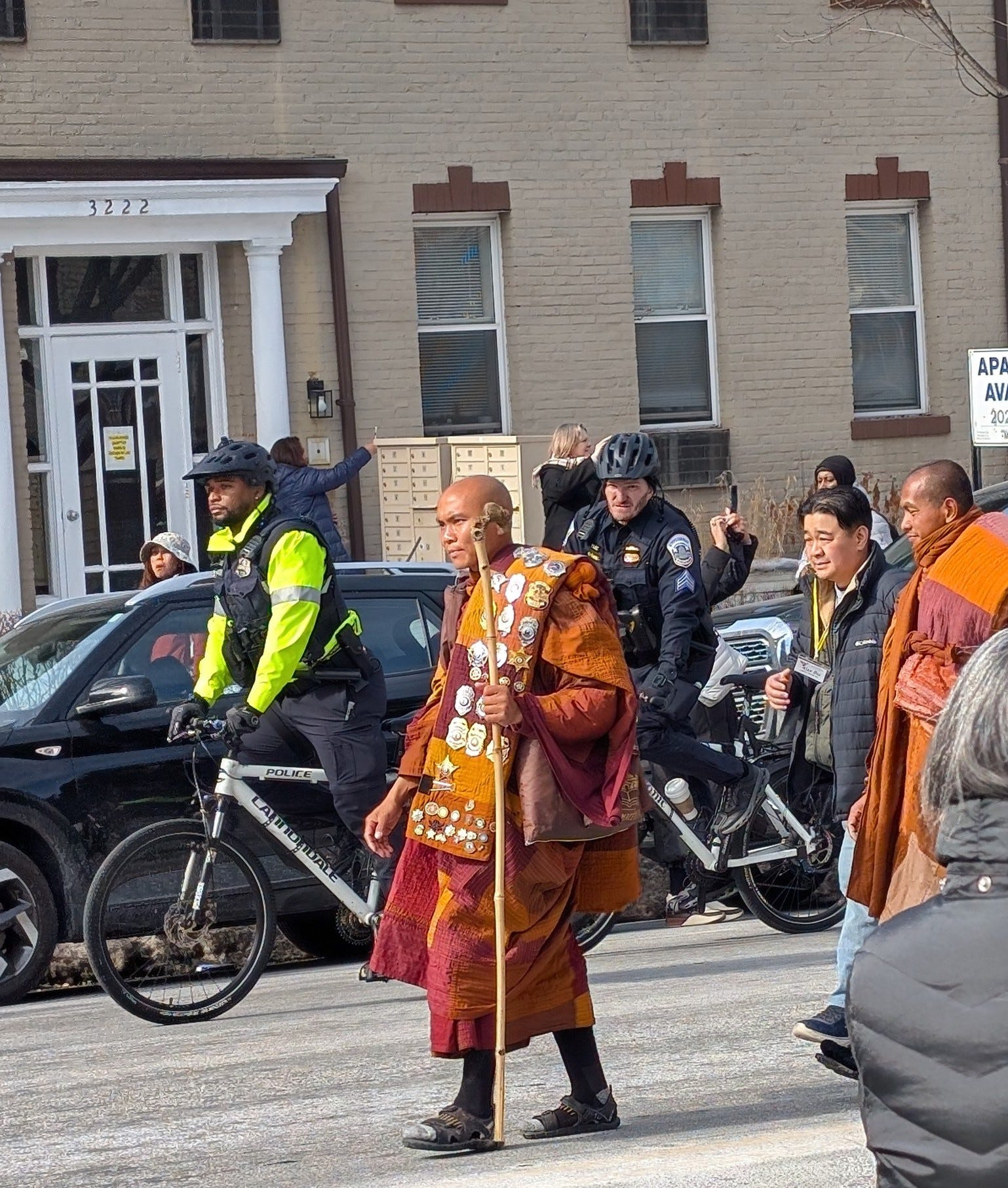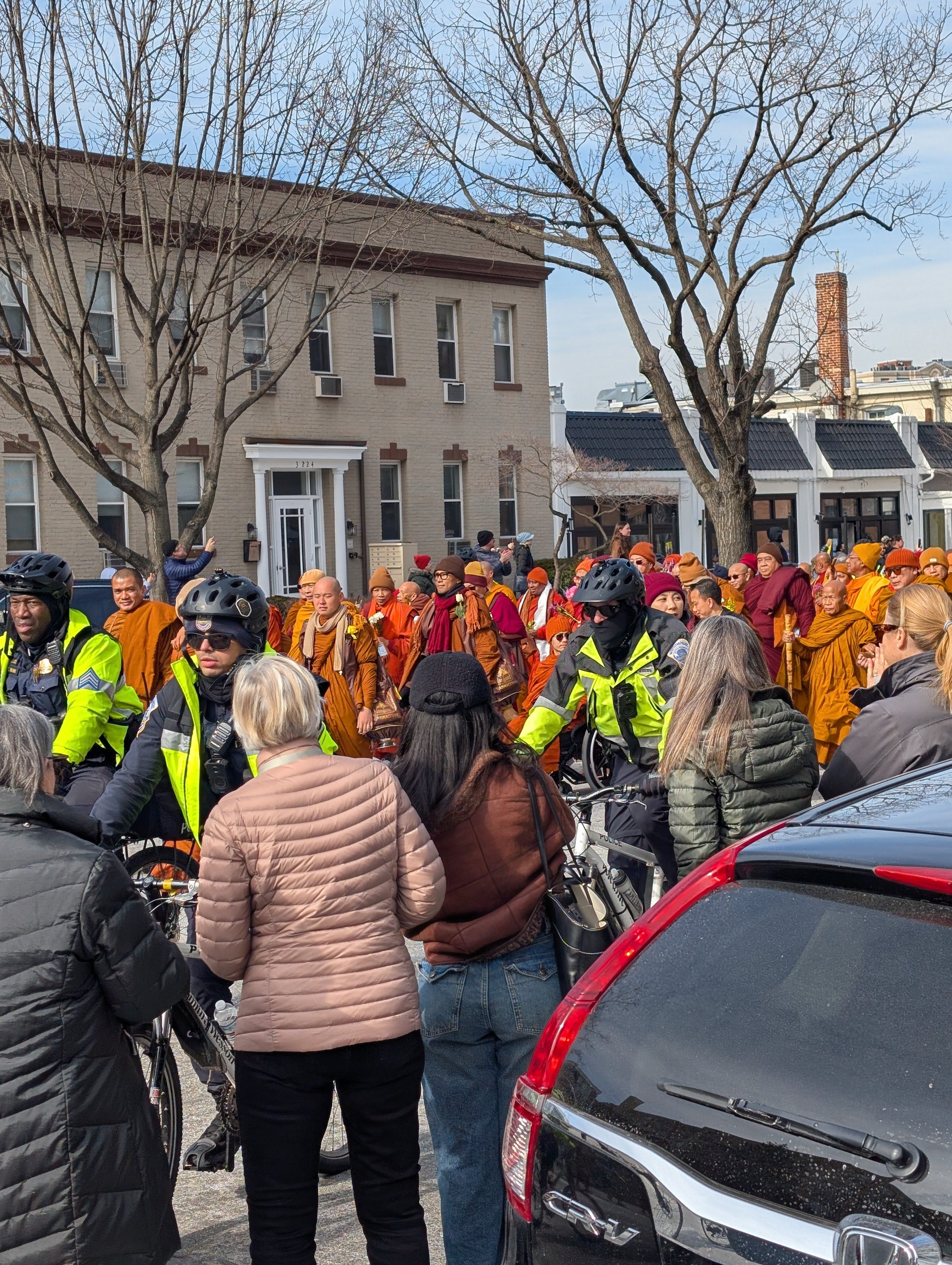 Just fortuitously, I happened to be in Washington DC on the day the monks happened to arrive there, the finale of their 2,300 mile walk. They’d tramped through heat and rain and snow and last weekend, bitter cold and howling winds. So I decided to head over to watch them arrive at the National Cathedral, only a few miles from where I’m staying.