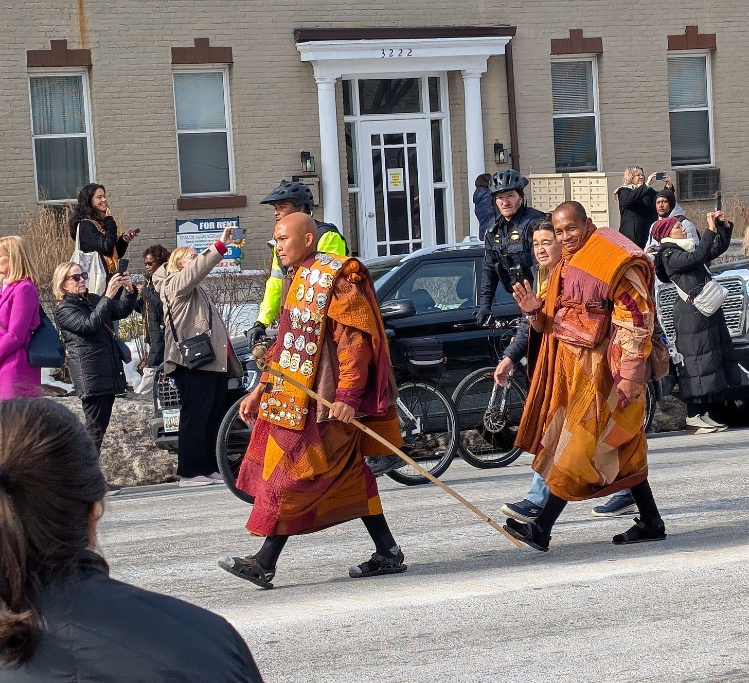 The crowd stood waiting patiently, and it wasn’t long—considering the monks had walked all the way from Texas, they were surprisingly on schedule. First came a convoy of police cars, then a fleet of officers on bicycles.